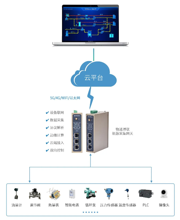 通過(guò)部署能源數(shù)采網(wǎng)關(guān),能夠?qū)崟r(shí)采集流量計(jì)、智能電表、熱量表、稱重儀器、循環(huán)泵、調(diào)節(jié)閥、溫度傳感器、壓力傳感器等設(shè)備,將供熱量、耗汽量、耗水量、耗電量、燃料消耗量、余熱利用量、溫度、壓力等數(shù)據(jù)對(duì)接到智慧供熱能源管理平臺(tái)中,從而將熱源、管網(wǎng)、中繼泵站、熱力站等納入統(tǒng)一的節(jié)能評(píng)價(jià)系統(tǒng)中,實(shí)現(xiàn)對(duì)能源的監(jiān)測(cè)、管理、統(tǒng)計(jì)與分析,助力提高能源利用效率與管理水平,實(shí)現(xiàn)節(jié)能、降本與增效的全面發(fā)展。